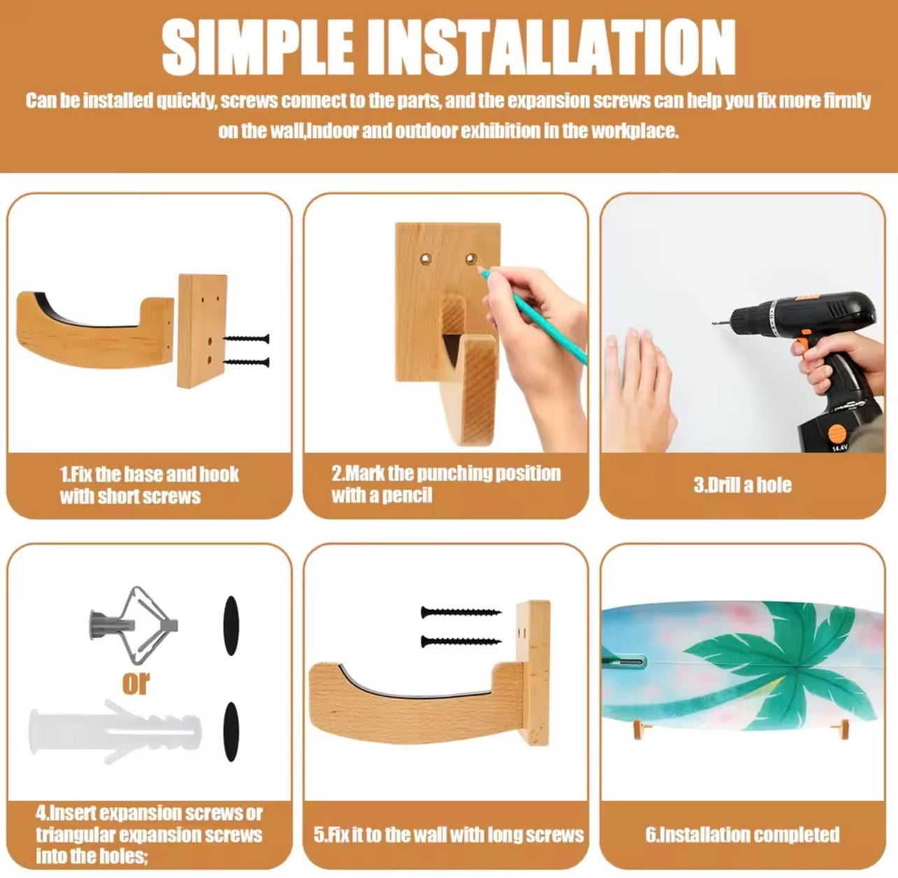 Wooden Surfboard Wall Rack, Wall Mounted Surfboard Display, Stand Hanger for Longboards Shortboards Skateboards or Snowboard.